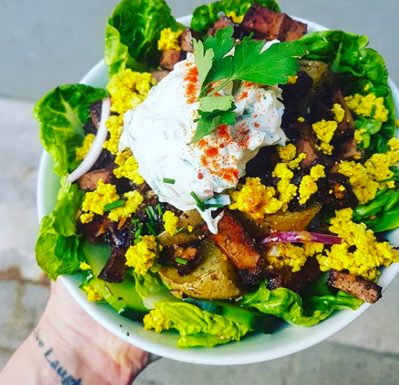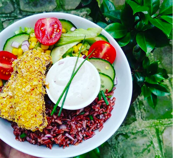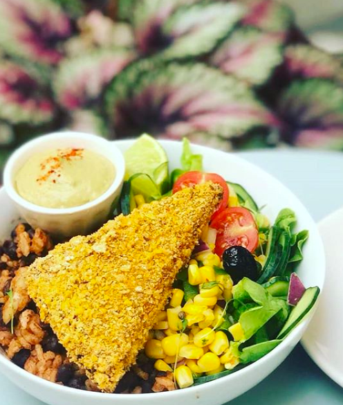 - Buddha bowl sans gluten de la semaine : féculents, légumes cuits de saison, crudités de saison, tofu cuisiné, herbes fraîches, graines, jeunes pousses et sauce maison