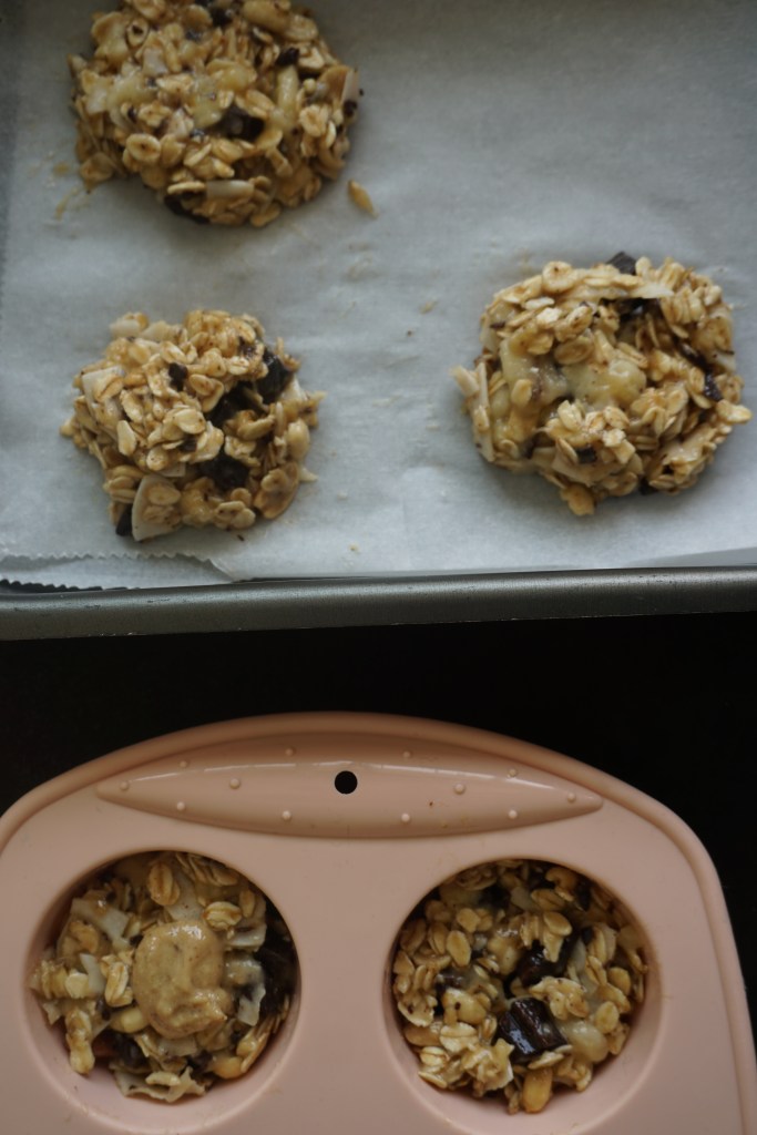 Dans un plat allant au four réalisez avec l’aide d’1 CS des gâteaux faisant des formes de cookies (voir les photos ce dessous) ou bien dans des moules de type muffins répartissez uniformément si c’est plus simple pour vous (voir aussi la photo ci dessous)