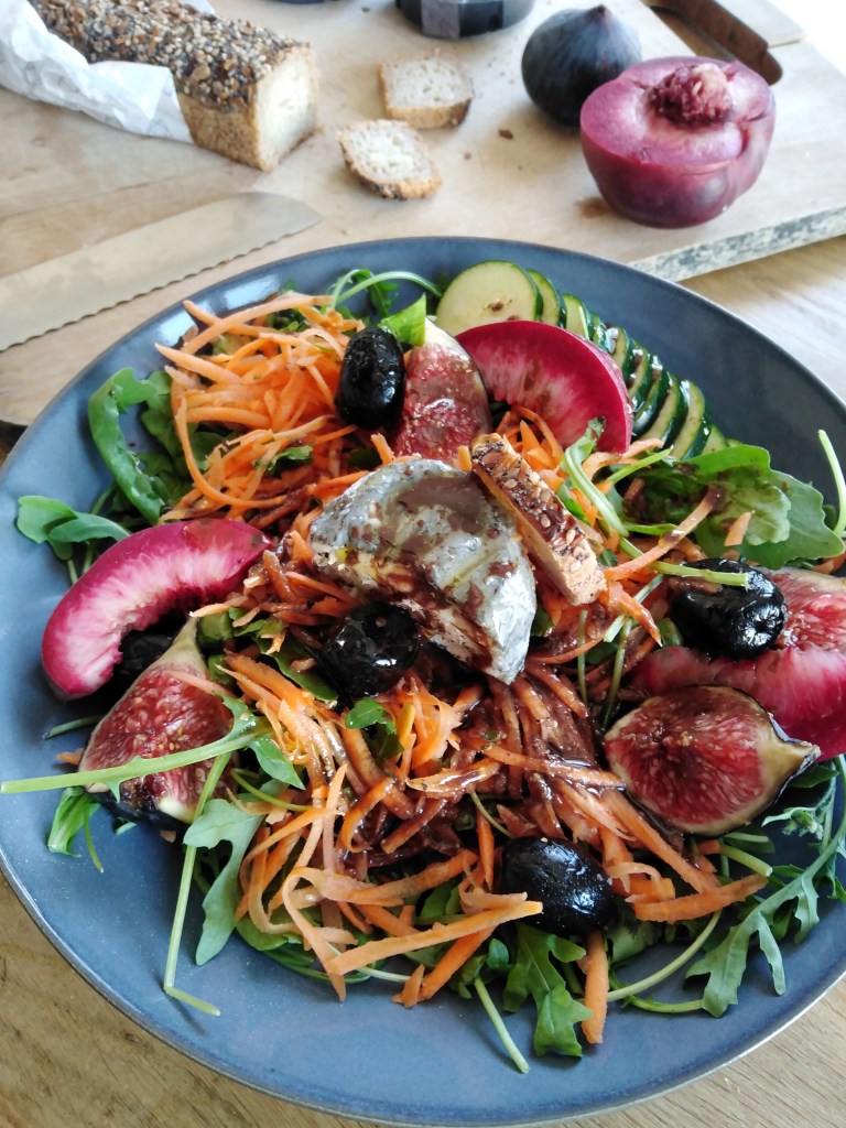 J’ai donc sauté sur l’occasion chez mon maraîcher et revenant de Amsterdam où le fromage de chèvre ne fait pas légion (ce sont plutôt des spécialités de fromage à pâte dure, comme l’Edam, le Gouda, etc.), je me suis aussi jetée sur un chèvre cendré car j’en raffole. Et l’association des deux, complété par des figues et des olives noires me semblaient parfaite. Ce le fût et pour cette raison découvrez la recette ci dessous, avec une sauce vinaigrette au cumin qui fera exploser l’ensemble.