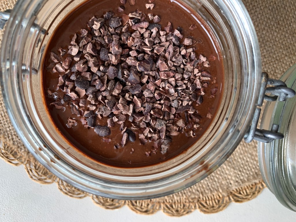 Versez la pâte à tartiner chocolat et cacao cru dans un pot puis ajoutez à nouveau et pour la décoration des pépites de cacao sur le dessus et c’est prêt ! Cette pâte à tartiner se conserve des semaines/mois durant au placard.
