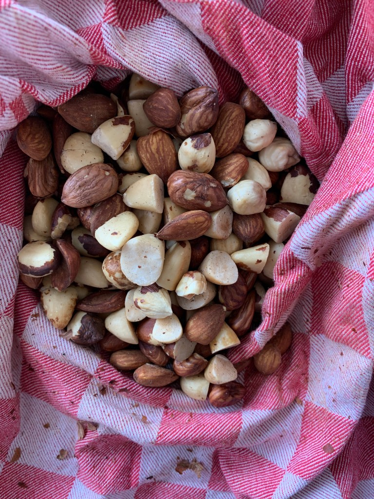 - Des oléagineux : ici il y a des amandes, des noisettes et des noix de d’Amazonie / dit aussi du Brésil mais prenez les oléagineux que vous préférez ou que vous avez dans votre placard. Les oléagineux contiennent déjà suffisamment d’huile pour ne pas avoir besoin d’en ajouter.