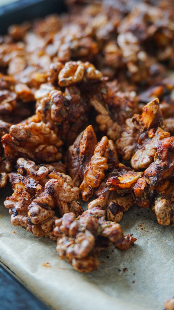 Lors d’un précédante recette sur mon blog, je vous proposais des noix caramélisées au paprika et au thym. Mélangez dans un saladier 230 g de noix décortiquées, 1 c. à s. d’huile d’olive, 1 c. à s. de paprika doux ou fort, 1 gousse d’ail si vous aimez l’ail (ou de l’ail en poudre, 1cc rase), 1 c. à s. de tamari strong ou de sauce soja (s’il n’est pas en version « strong », ajoutez une pincée de sel), 1 c. à s. de sirop d’érable, 1 c. à c. de thym sec ou frais et 4/5 tours de moulin à Poivre noir. Étalez-les sur une plaque recouverte de papier cuisson, puis les faire rôtir 30 minutes à 150°C.