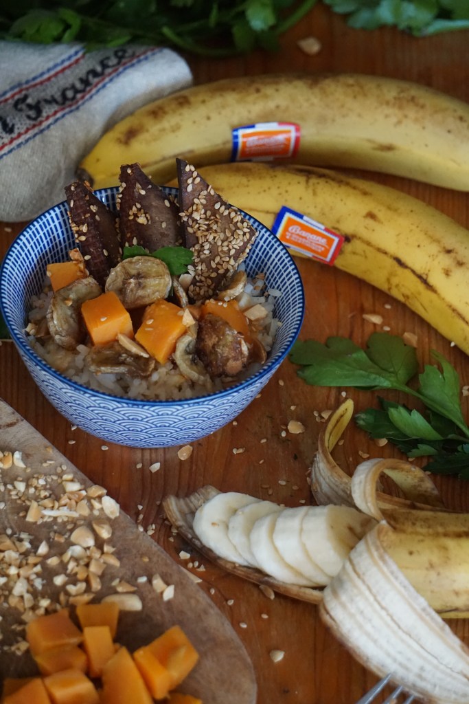 Recette salée, vegan et de saison « Banane rôtie, Tofu mariné au sésame, Brocoli et Patate Douce, Riz et sauce crémeuse coco-cumin-gingembre / sponsorisée par les Bananes de Guadeloupe et Martinique